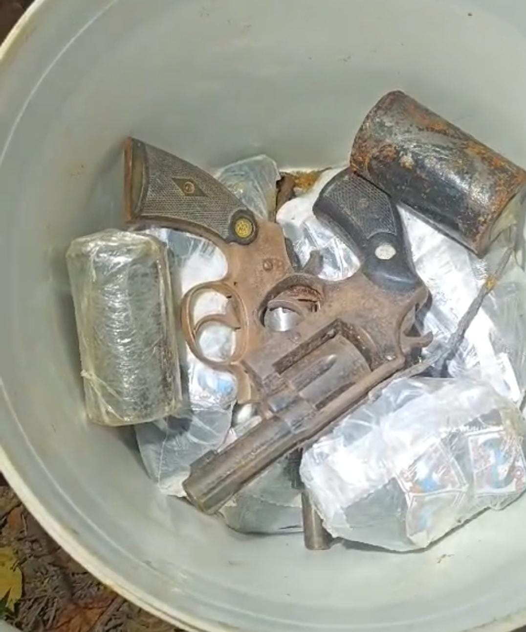 A equipe policial seguiu para a residência do jovem, onde, com a autorização do pai, realizou buscas. No quarto do menor, foram encontrados dezenas de pinos de cocaína. Além disso, nos fundos da casa, os policiais localizaram mais dois revólveres calibre .38, tabletes de maconha, cocaína e duas granadas artesanais. Diante do perigo, o BOPE foi acionado para realizar a detonação segura dos explosivos.