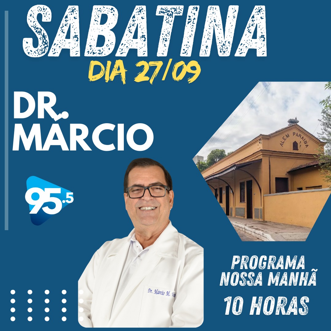 “ hoje dia 27 quinto e ultimo dia da Sabatina com os candidatos à Prefeitura Municipal de Além Paraíba. O evento será realizado às 10h, no programa Nossa Manhã, com apresentação de André Carluccio. No quinto dia de sabatina, o convidado para responder às perguntas será a candidato Dr. Márcio Valverde