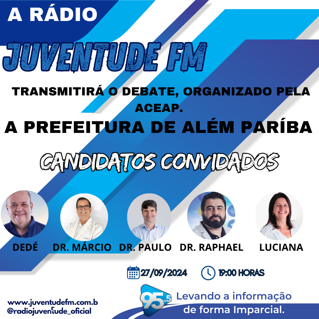 A Rádio Juventude FM vai transmitir ao vivo o Debate à Prefeitura de Além Paraíba, organizado pela ACEAP, no dia 27 de setembro, às 19 horas. Todos os cinco candidatos confirmaram presença: Dedé, Dr. Márcio Valverde, Dr. Rafael, Dr. Paulo e Luciana. Não perca esse importante momento para conhecer as propostas e ideias de quem pode ser o próximo prefeito de Além Paraíba!