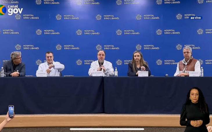 O petista, que estava internado no Hospital Sírio-Libanês, em São Paulo, apareceu de surpresa durante a coletiva de imprensa com a sua equipe médica.