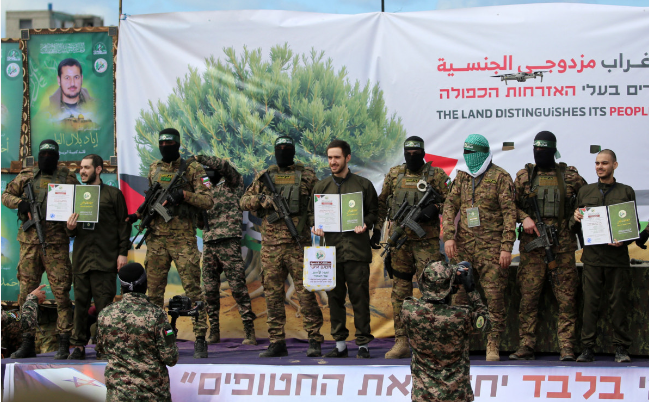 Os três homens foram obrigados, por homens armados e encapuzados, a subir em um palco diante de uma multidão de moradores de Gaza. Em seguida, eles foram escoltados até os veículos do CICV em Nuseirat, no centro de Gaza.