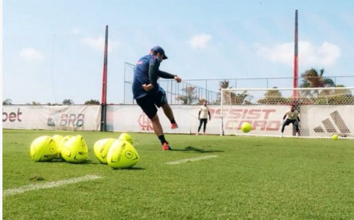 O Flamengo adicionou uma bola com formato diferente para o treino de goleiros. Nas imagens que o Rubro-Negro divulgou da atividade desta segunda-feira (10), é possível ver a “Reflex-Ball”, que tem um formato triangular e é utilizada para trabalhar os reflexos dos arqueiros.