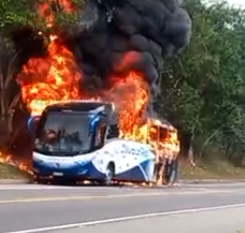 Um ônibus da Viação Silva Rio Turismo pegou fogo no início da tarde desta sexta-feira (30/05) na BR-116, no quilômetro 12, próximo ao vale da ternura (caixote). O motorista do veículo informou que o incêndio teria sido causado por uma pane elétrica. As chamas se alastraram rapidamente, atingindo a vegetação às margens da rodovia.