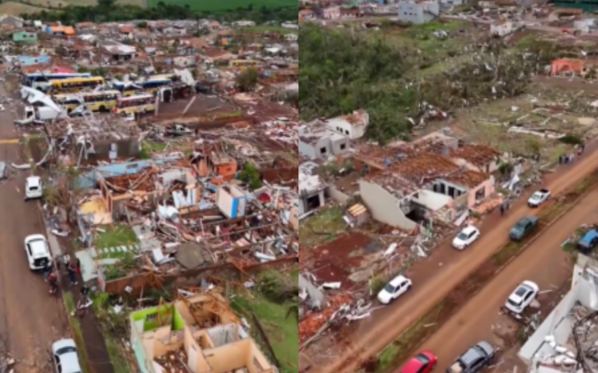 O cenário é descrito como de destruição quase completa: o município estima que 90% da área urbana foi afetada e que cerca de 700 casas foram danificadas. Em entrevista ao Estadão neste domingo, 9, a capitã Luisiana Guimarães Cavalca, que representa o Corpo de Bombeiros e a Defesa Civil, informou que equipes ainda percorrem as áreas atingidas e georreferenciam imóveis danificados pelo tornado, que gerou ventos acima de 250 km/h, matou seis pessoas e feriu mais de 800 moradores.